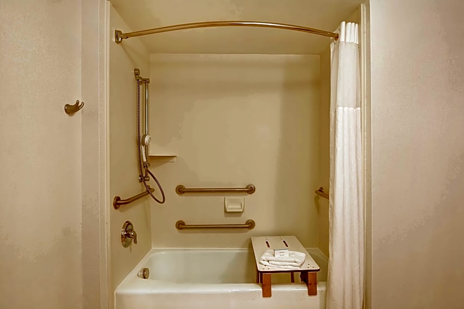 This mobility and hearing accessible, non-smoking room features one double-sized bed, and an accessible bathtub. The room also has a visual alarm and notification devices for the doorbell or door knock and incoming phone calls. The room features comfortable soft seating, microwave, refrigerator, a HDTV, and easy to operate alarm clock/radio. The free WiFi access will help you stay connected while on the road. If you prefer not to work at the desk, you can use the convenient lapdesk instead. This room also includes an in-room movie channel, deluxe bath products, and a coffee machine. Any corresponding photo may not reflect the specific accessible room type or room feature.